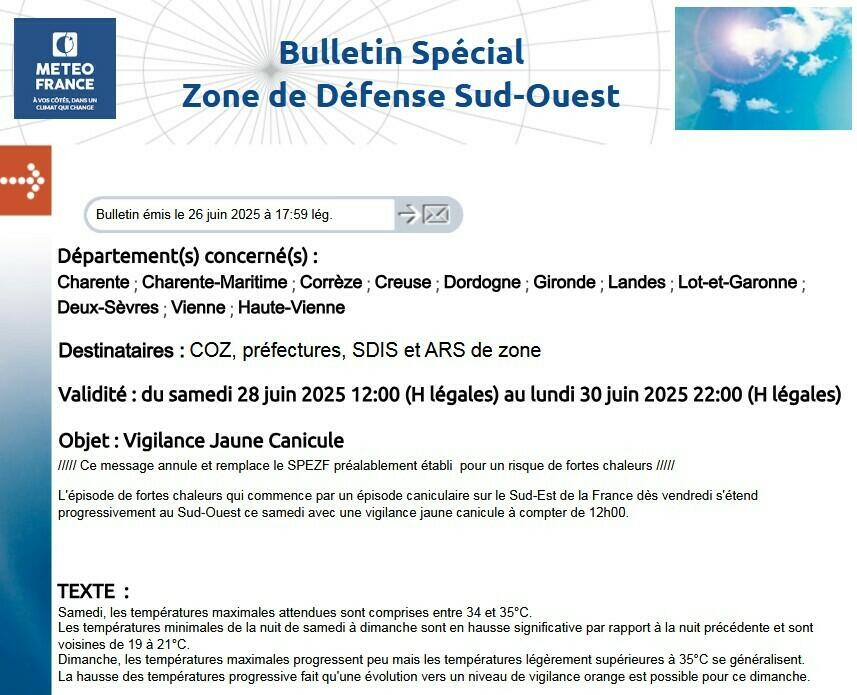 Pour votre information, Météo France vient de placer le département de la Vienne en vigilance jaune renforcé SPEZF canicule  à compter de 12h demain samedi 28 juin 2025.