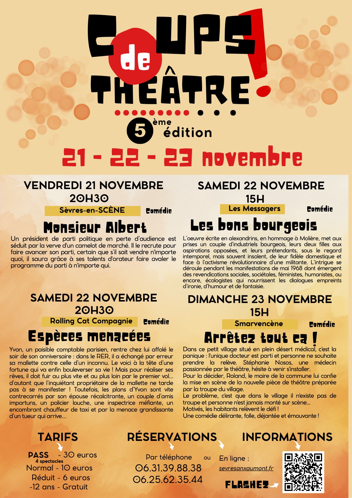 Le festival Coups de théâtre revient à Sèvres-Anxaumont du vendredi 21 au dimanche 23 novembre. Découvrez 4 nouvelles pièces mises à l'honneur par les troupes locales !