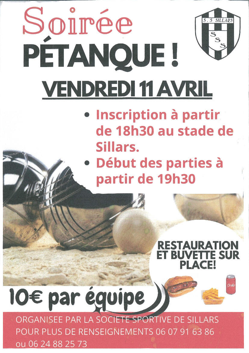 Soirée Pétanque de la Société sportive de Sillars 13/3/25 Retenez la date du vendredi 11 avril à partir de 18h30 au stade