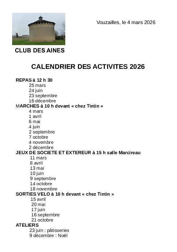 Retrouvez en pièce jointe le calendrier 2026 des activités mises en place par le club des aînés de Vouzailles
