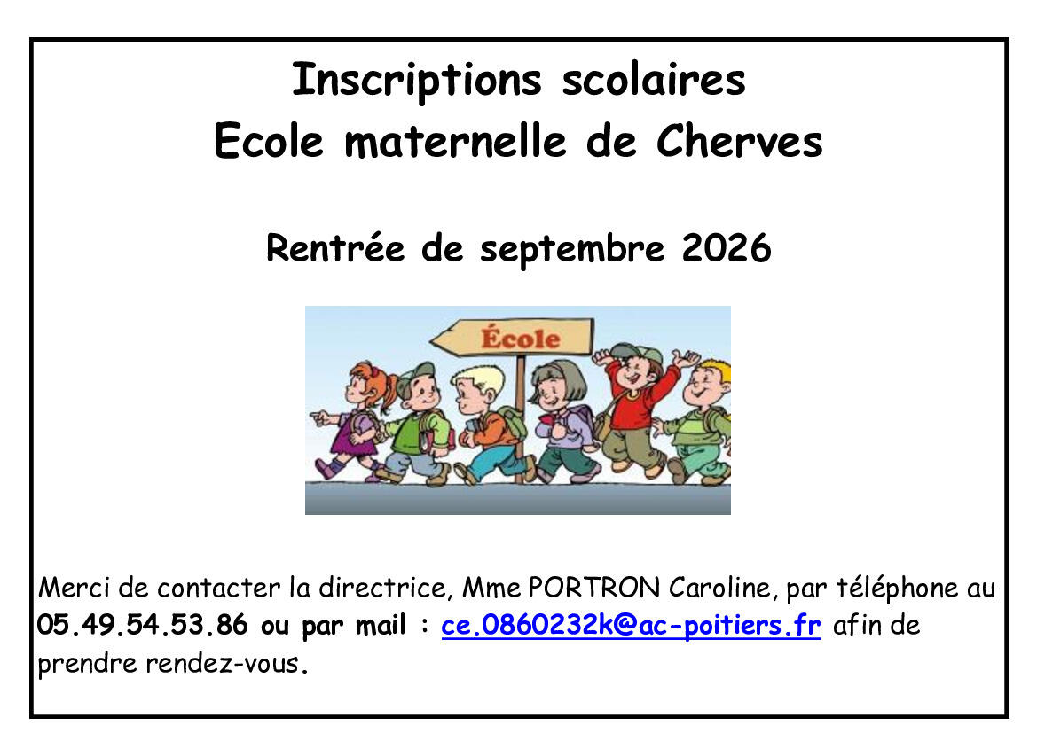 RPI Inscription Ecole de Cherves 8/4/26 Les inscriptions à l'école de Cherves sont ouvertes. Source : Mairie de Vouzailles