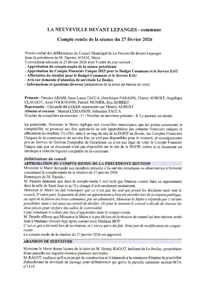 Le compte-rendu de la réunion du conseil municipal du 27 février 2026 est disponible dans les services sur la page d'accueil de l'application