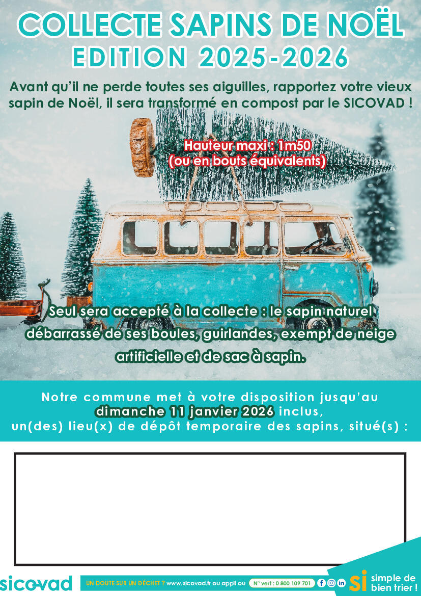 Le SICOVAD organise une collecte des sapins de Noël totalement débarrassés de leurs décorations et exempts de neige artificielle. La hauteur maximale des sapins ne devra pas dépasser 1,50 m (ou en bouts équivalents)