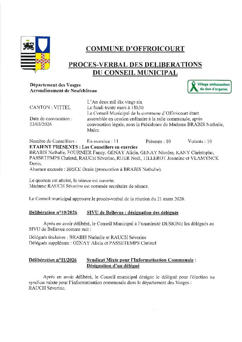 Vous trouverez en pièces jointes le compte rendu et le procès-verbal de la réunion du Conseil municipal en date du 30 mars 2026.