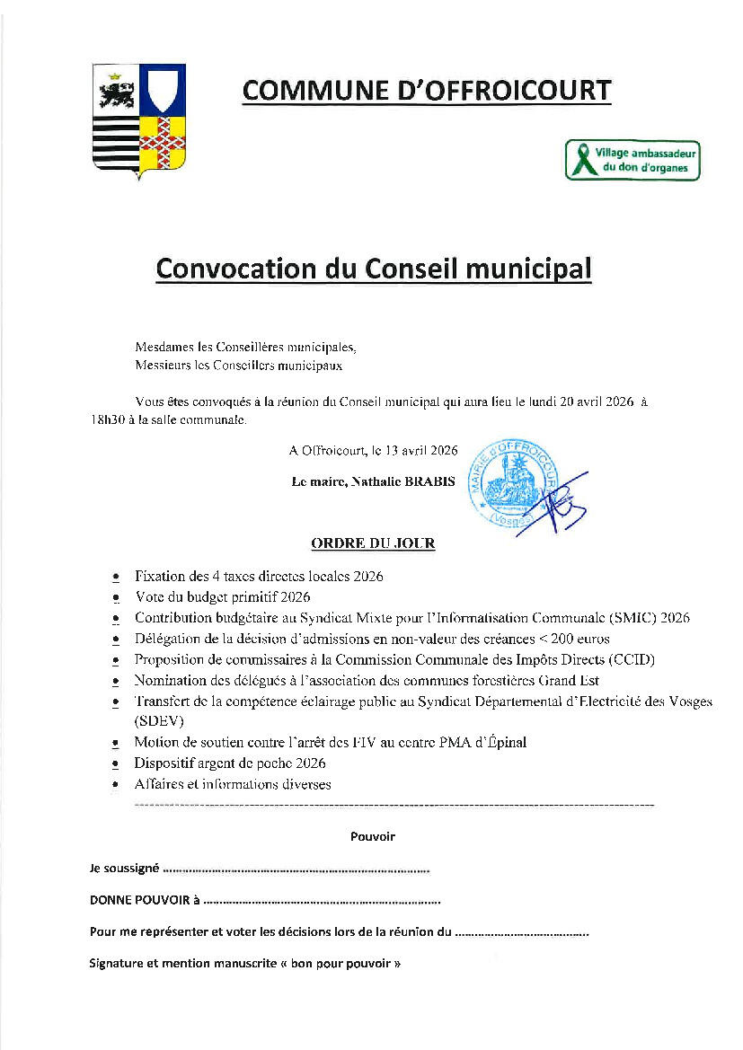 Convocation du Conseil municipal le 20 avril 2026 13/4/26 Le Conseil municipal est convoqué le lundi 20 avril 2026 à 18h30.