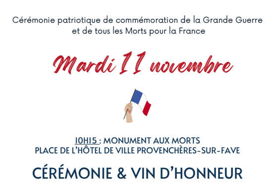 À l'occasion de la commémoration de l'Armistice du 11 novembre 1918, la commune de Provenchères et Colroy vous invite à participer à la cérémonie du souvenir qui se tiendra mardi 11 novembre à 10h15 , au monument aux mort de Provenchères sur Fave.