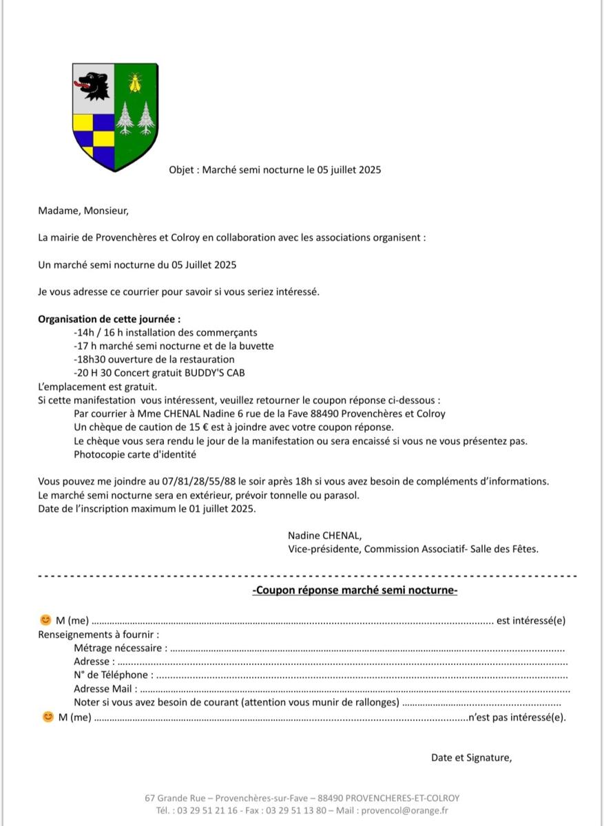 Si cette manifestation vous intéressent, veuillez retourner le ou les coupons réponse ci-joint par courrier à Mme CHENAL Nadine 6 rue de la Fave 88490 Provenchères et Colroy.