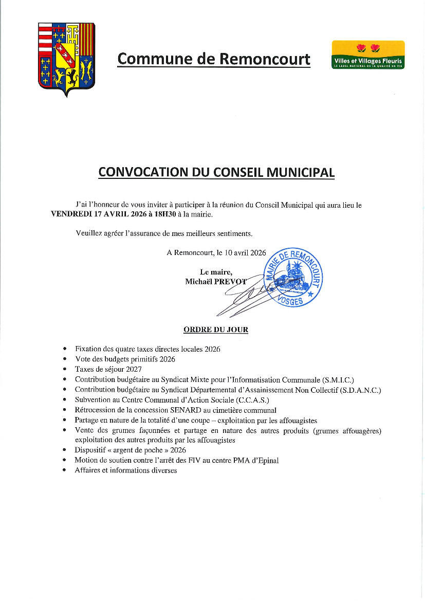 Le Conseil municipla est convoqué le vendredi 17 avril 2026 à 18h30 en mairie de Remoncourt.