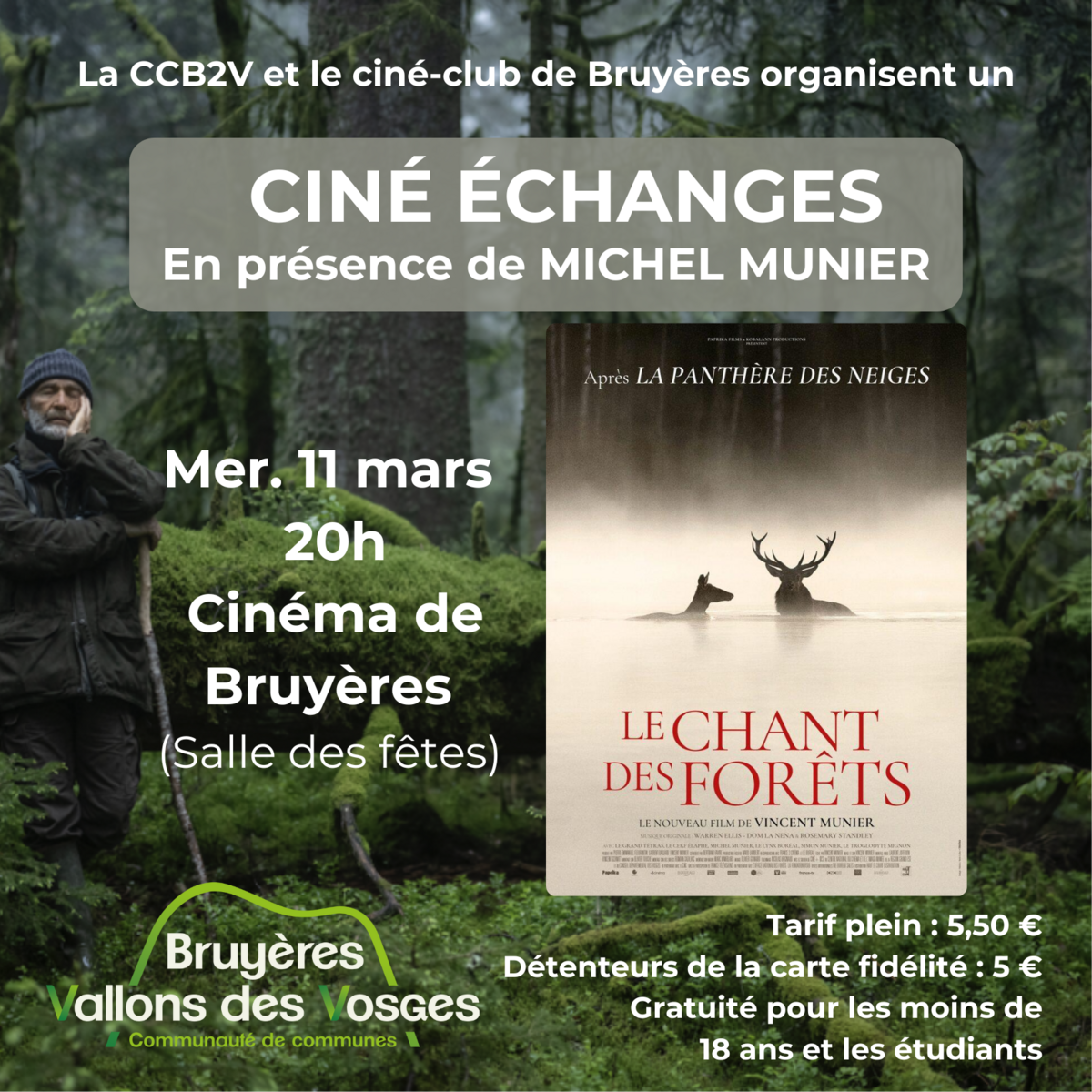 La CCB2V, en partenariat avec le ciné-club de Bruyères, vous invite à une soirée exceptionnelle le mercredi 11 mars. À 20h, la salle des fêtes de Bruyères accueillera la projection du documentaire « Le Chant des forêts » de Vincent Munier, nommé aux César. Le film nous plonge au cœur des forêts vosgiennes à travers trois générations unies par une même passion pour la vie sauvage. La projection sera suivie d’un temps d’échange avec Michel Munier, naturaliste et acteur du film.