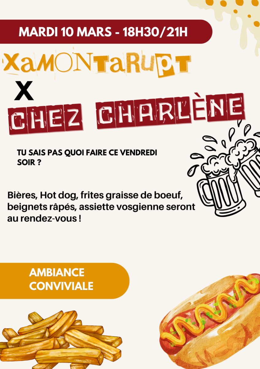 Le food truck " Chez Charlène" sera sur la place de l'abri bus mardi 10 mars à partir de 18h30.