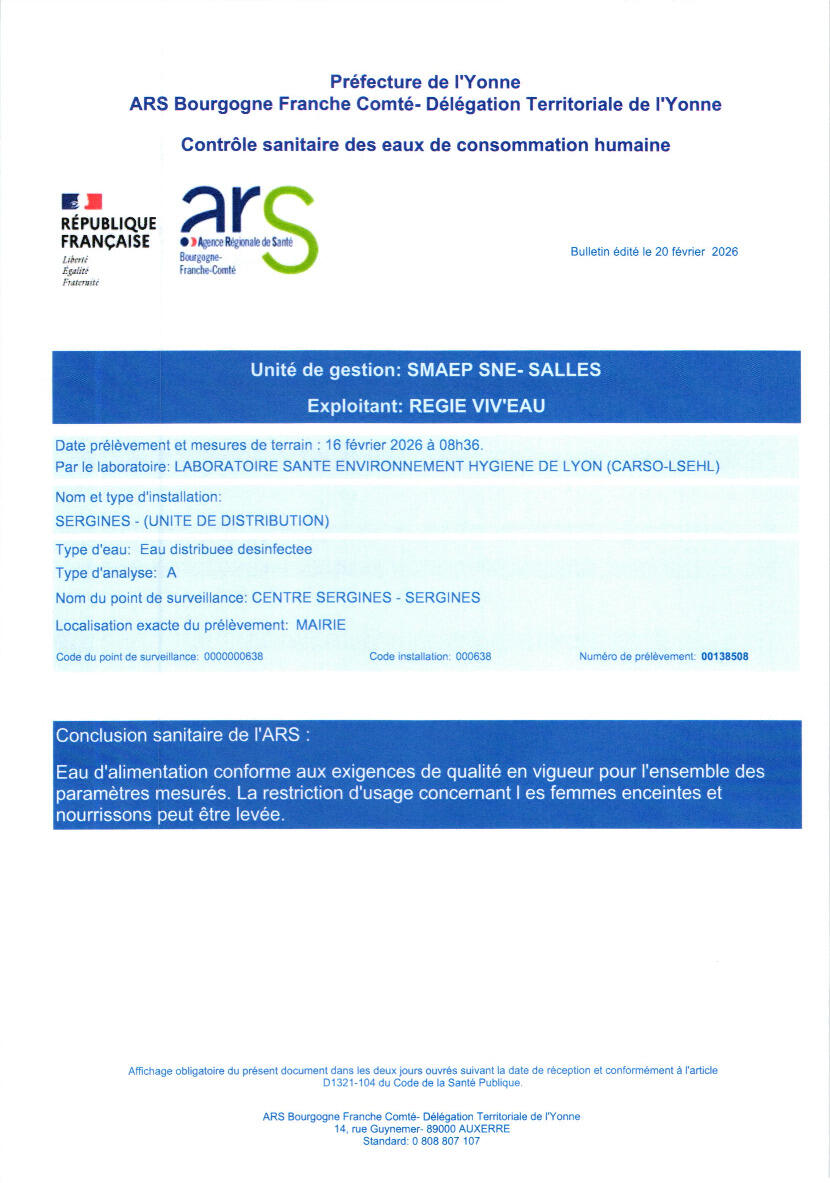 LES ANALYSES DE L' A.R.S du lundi 16 février 2026