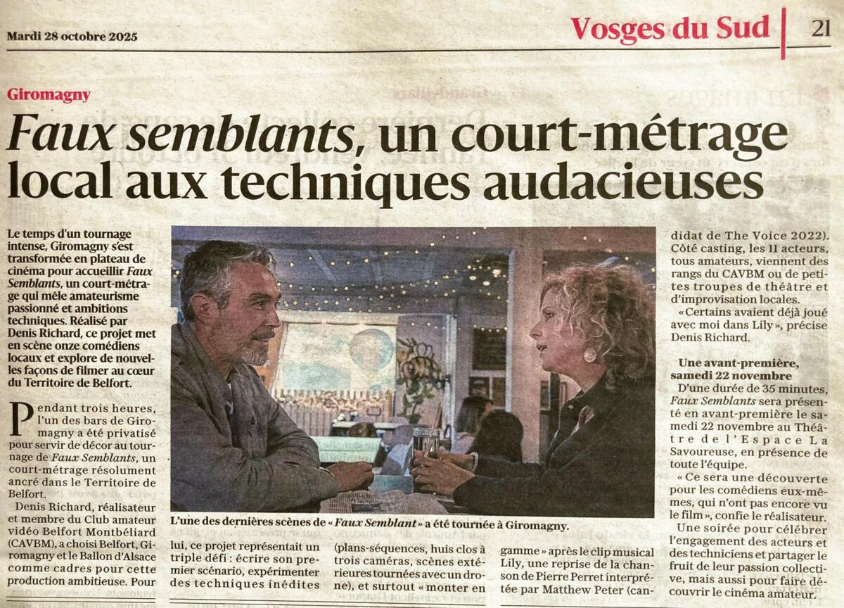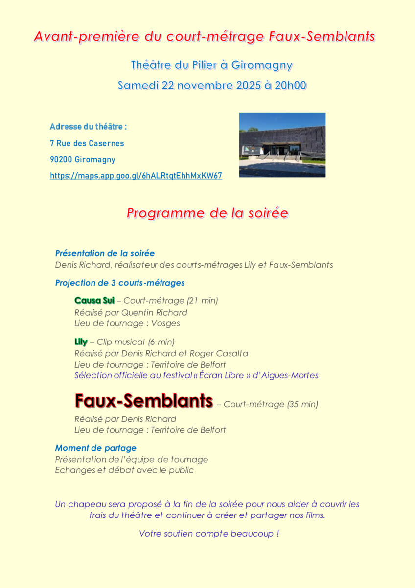 Court-métrage Faux-Semblants 28/10/25 Avant-première le samedi 22 novembre 2025 à 20h00 au Théâtre du Pilier à Giromagny.