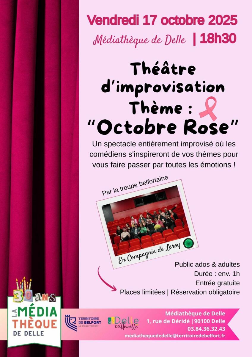 Dans le cadre d'OCTOBRE ROSE, la médiathèque vous invite à un spectacle d'improvisation théâtrale, animé par la troupe belfortaine En compagnie de Leroy.