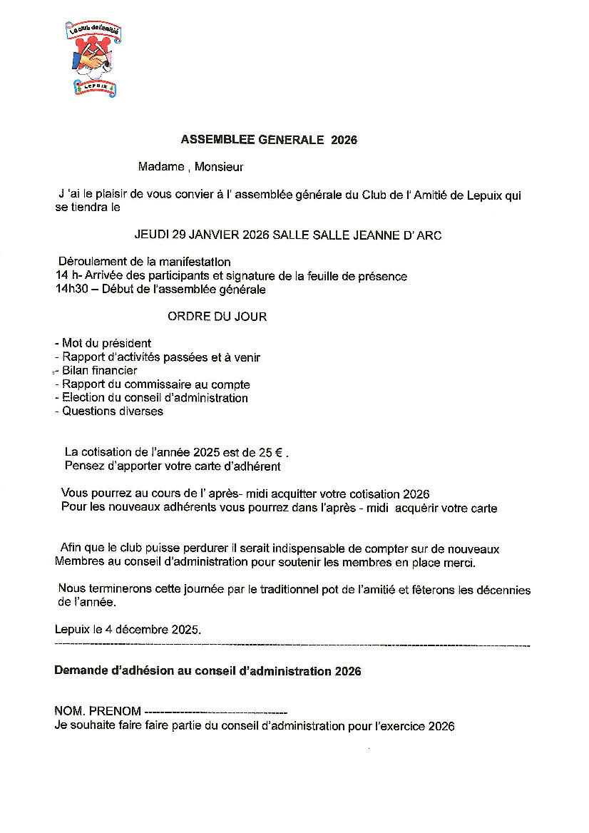 Assemblée Générale du Club de l'Amitié - 29 janvier