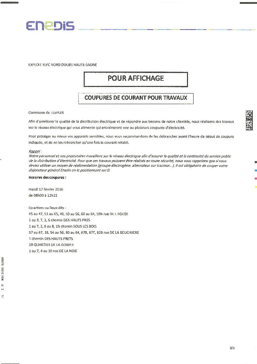 AVIS COUPURE D’ELECTRICITE 2/2/26 le 17 février 2026, matin et après-midi rues concernées dans les 4 avis ci-dessous