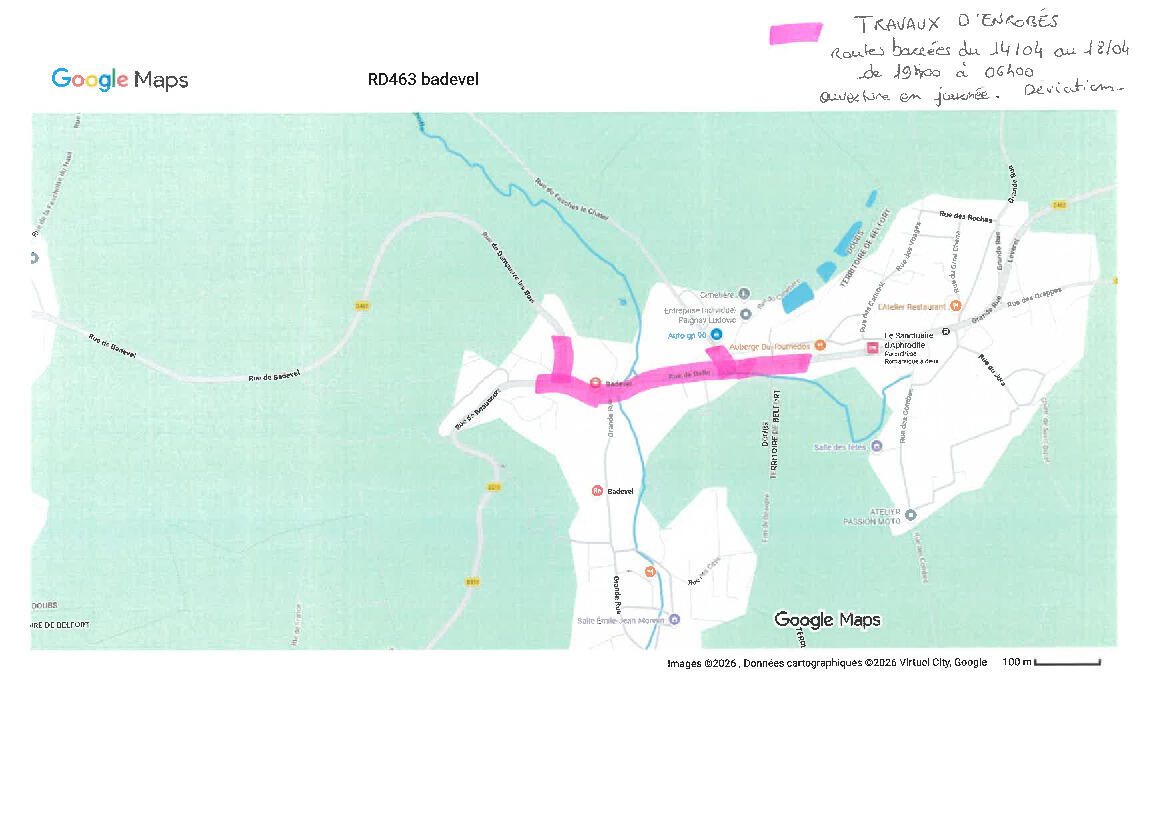 Le Département du Doubs nous informe par arrêté de police, que la circulation, sur les routes départementales D209, D463, D210, traversant Badevel et Fêche-l'Eglise, sera interdite à tous les véhicules, dans les deux sens de circulation, durant 11 jours entre le lundi 13 avril 2026 au vendredi 24 avril 2026 de 19h00 à 06h00, afin de réaliser les travaux d'enrobés.