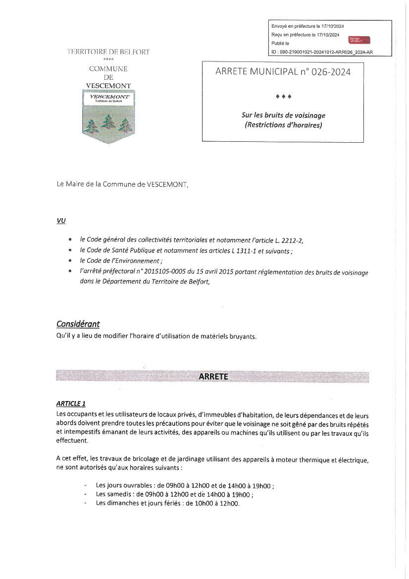 Il est complété par l’arrêté municipal n° 026-2024 du 11 octobre 2024 qui réglemente et uniformise les différentes plages horaires sur lesquelles les travaux de jardinage et de bricolage peuvent être effectués.