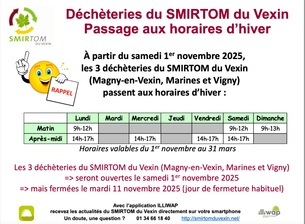 NOUVEAUX HORAIRES DU SMIRTOM AU 1er novembre