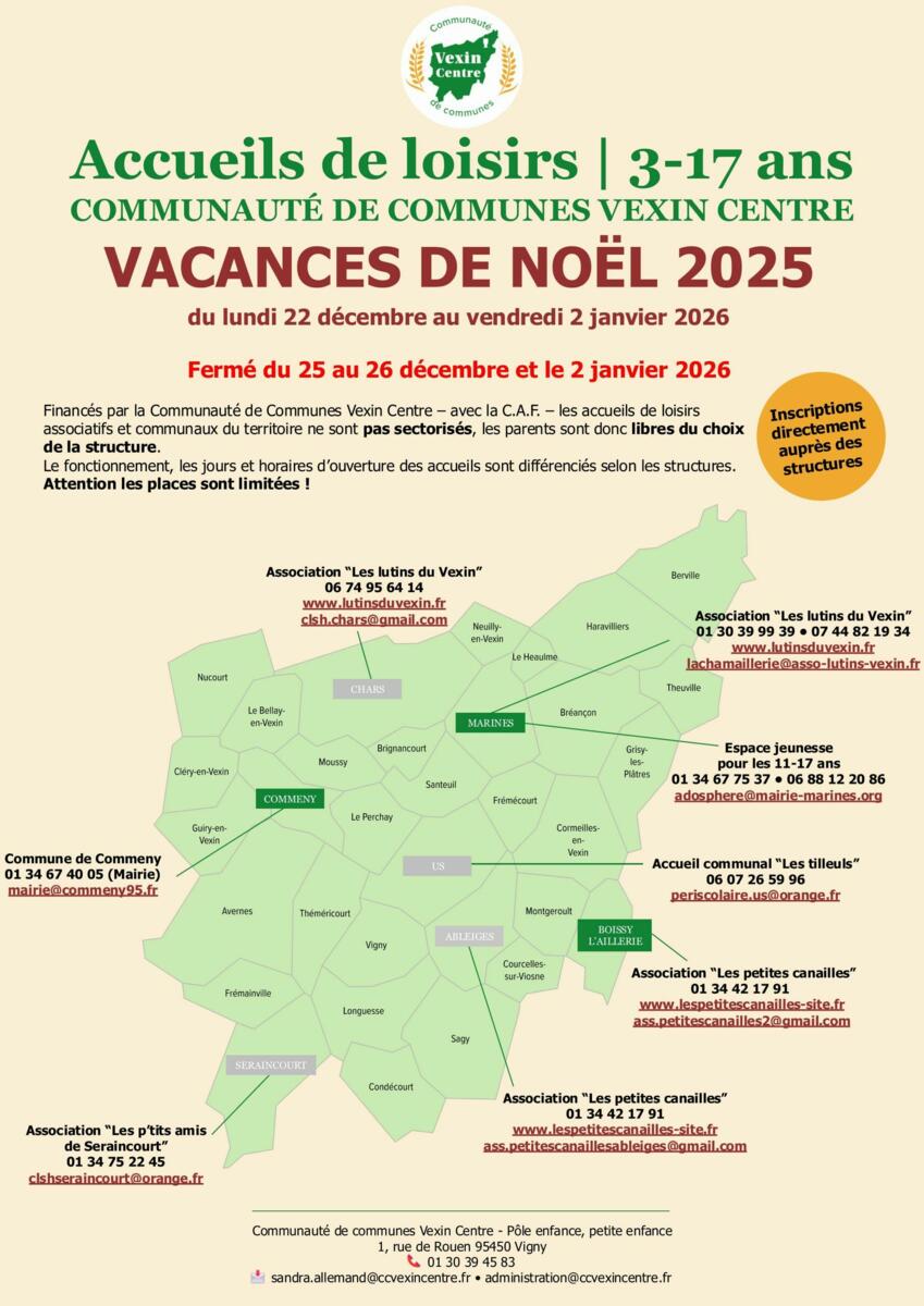 Durant les vacances de Noël, les accueils de loisirs de la CCVC sont ouverts du lundi 22 décembre 2025 au vendredi 2 janvier 2026 pour les enfants de 3 à 17 ans.