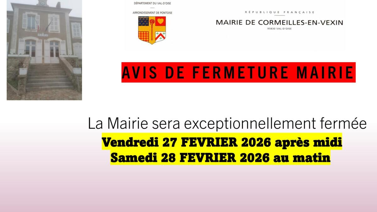 ERRATUM La Mairie sera exceptionnellement fermée le Vendredi 27 FEVRIER 2026 après midi et Samedi 28 FEVRIER 2026 au matin.