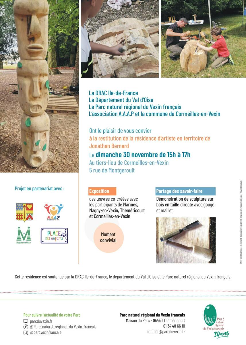 Après plusieurs heures de travail, de passion et de création, la DRAC, le Département, le Parc Naturel Régional du Vexin Français, conjointement avec l’AAAP et la commune de Cormeilles-en-Vexin ont le plaisir de vous convier à la restitution des sculptures sur bois réalisées par Jonathan Bernard et les habitants :