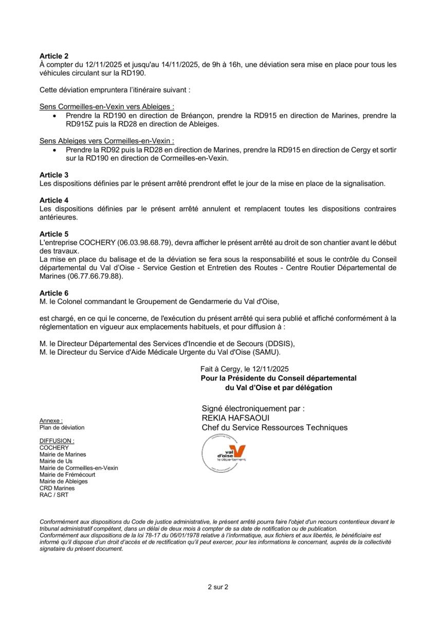 Les services du Département interviennent sur la RD 190 pour la mise à niveau des tampons sur la RD 190 entre Ableiges et Cormeilles-en-Vexin jusqu’au 14 Novembre 2025 de 9H00 à 16H00. La circulation sera interdite et une déviation sera mise en place.