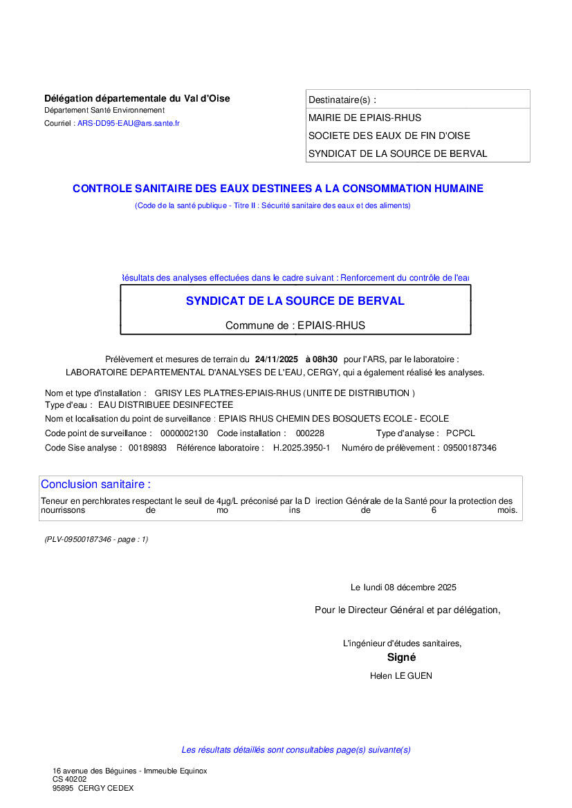 Vous trouverez en piece jointe, le bulletin relatif aux derniers resultats d'analyses du contrôle sanitaire reglementaire de l'eau.