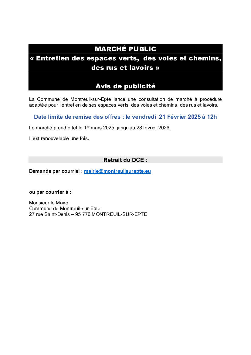 La Commune de Montreuil-sur-Epte lance une consultation pour le Marché public "Entretien des espaces verts, des voies et chemins, des rus et lavoirs"