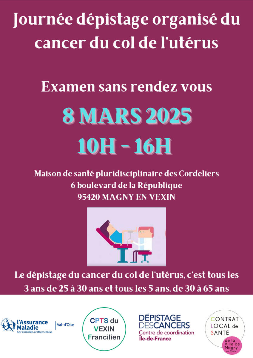 Examen sans rendez-vous le samedi 8 mars 2025 de 10h à 16h à la Maison de santé pluridisciplinaire des Cordeliers 6 boulevard de la République 95420 Magny en Vexin.