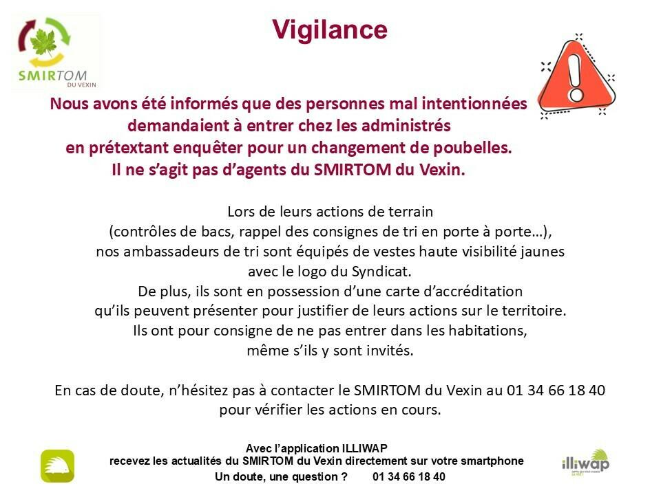 ATTENTION des personnes mal intentionnées demandent à entrer chez les administrés en prétextant enquêter pour un changement de poubelles. Il ne s’agit pas d’agents du SMIRTOM du VEXIN