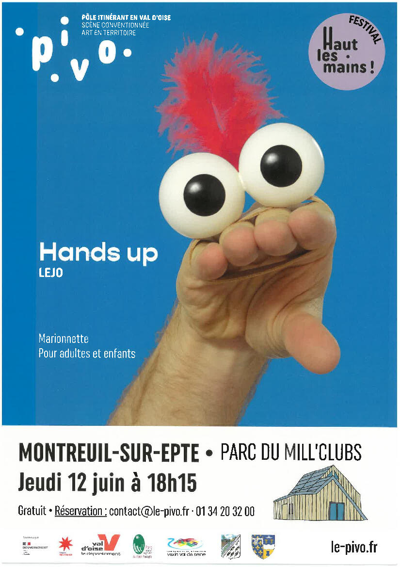 Le PIVO vous propose  "Hands up" un spectacle GRATUIT de marionnette pour adultes et enfants le jeudi 12 juin à 18h15 au Mil'Clubs à Montreuil-sur-Epte.