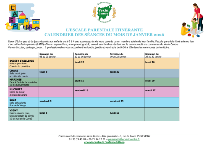 Vous trouverez en pièce jointe le planning des escales parentales (lieu d’accueil enfants-parents ou LAEP) pour le mois de janvier 2026. Ces moments d’échanges entre parents et enfants sont gratuits et permettent de :