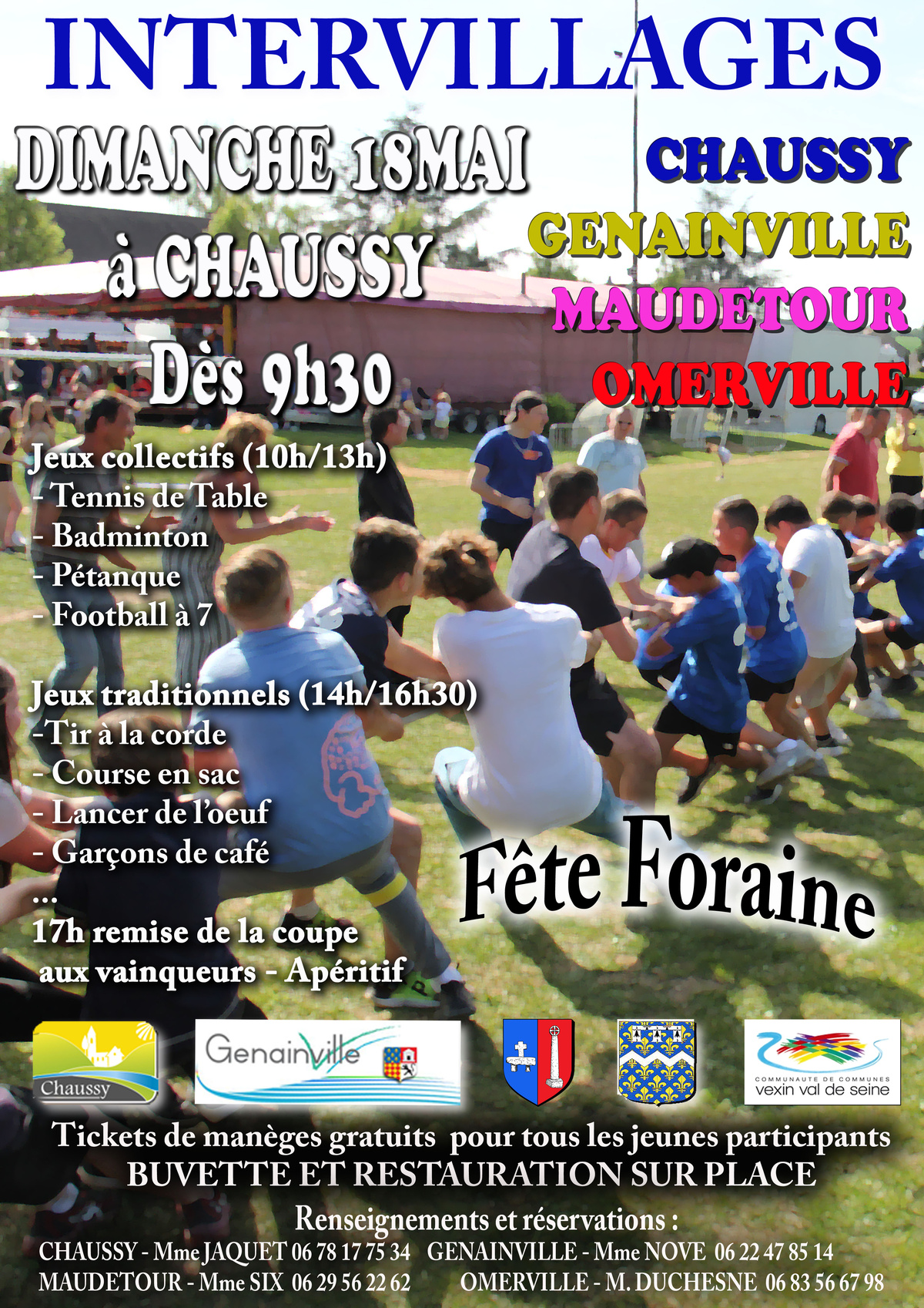 Venez nombreux le dimanche 18 mai de 10h à 17h à Chaussy pour participer aux Jeux intervillages entre Chaussy, Genainville, Maudétour et Omerville. Jeux par équipes le matin (football, badminton, ping-pong, pétanque) et jeux traditionnels l'après-midi (lancer d'oeufs, course en sac, tir à la corde, garçons de café...).