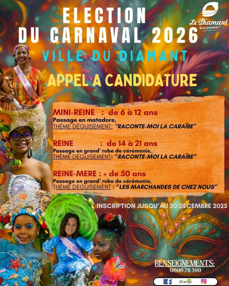 Dans le cadre de son appel à candidature pour l’élection des représentantes pour le Carnaval 2026, la Ville du DIAMANT s'inscrit dans une dynamique de valorisation de nos traditions carnavalesques qui participe de notre richesse culturelle et patrimoniale.