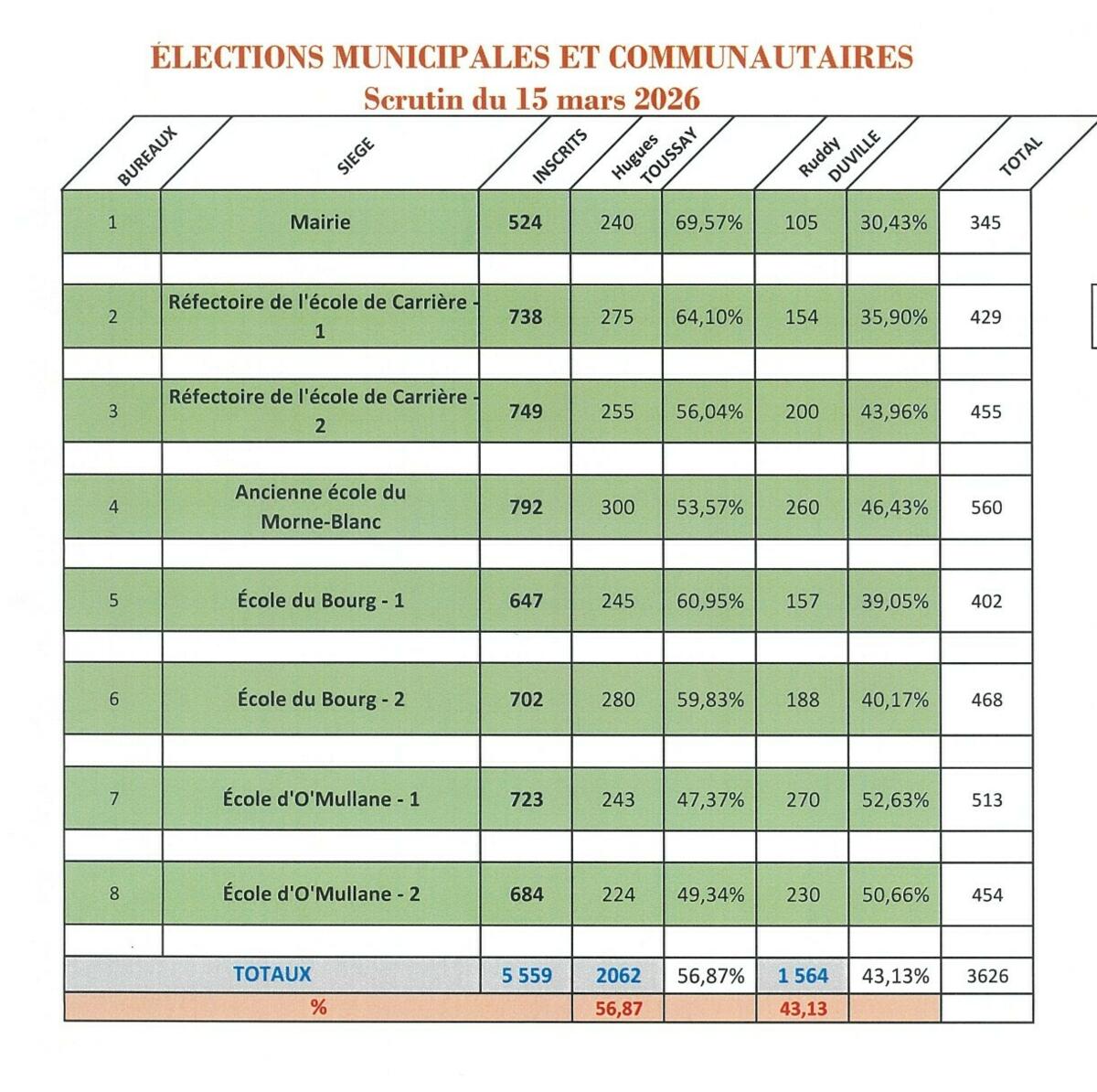 👉Dans le cadre du scrutin du Dimanche 15 mars 2026, retrouvez les résultats enregistrés par bureau de vote pour la Ville du DIAMANT.