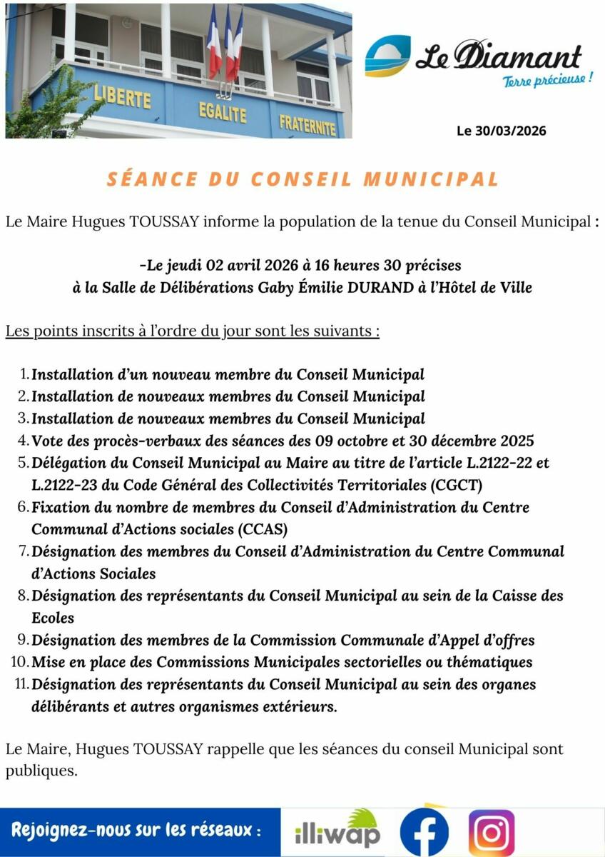 Le Maire Hugues TOUSSAY informe la population de la tenue du Conseil Municipal, le jeudi 02 avril 2026 ร 16 heures 30 prรฉcises, ร la Salle de Dรฉlibรฉrations Gaby รmilie DURAND ร l'Hรดtel de Ville.