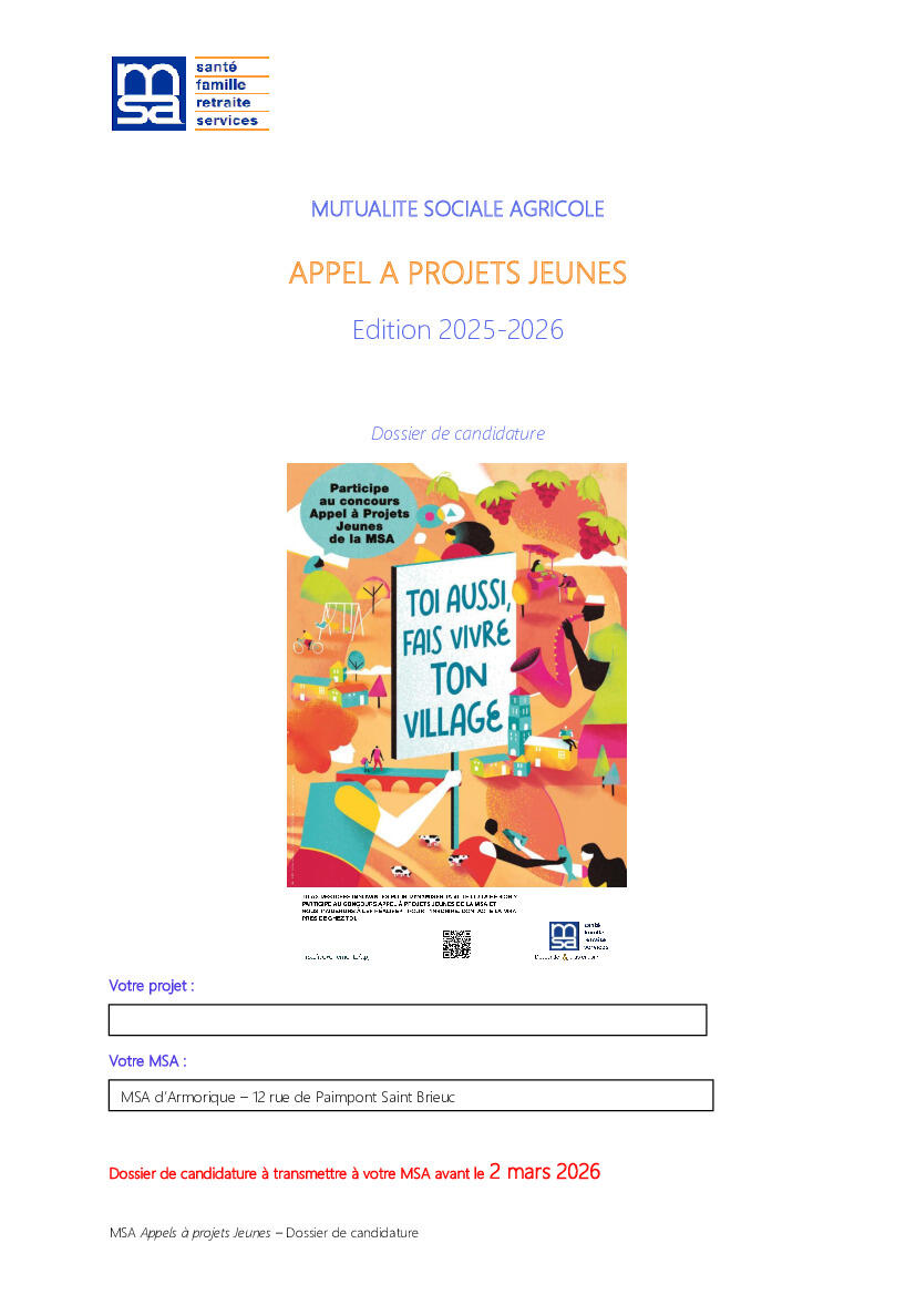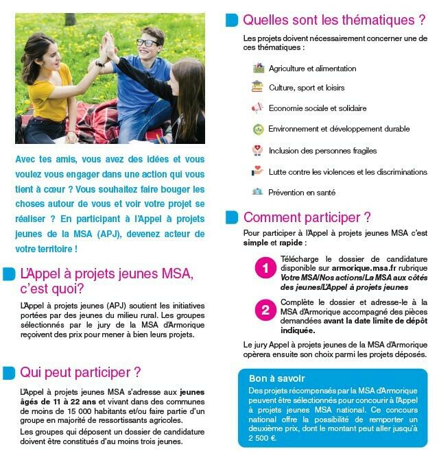 Comme chaque année, la MSA d’Armorique organise le concours « Appel à Projets Jeunes : Mieux vivre en milieu rural » visant à soutenir les projets collectifs des jeunes de 11 à 22 ans. (Sur les communes de moins de 15 000 habitants, il n'est pas nécessaire d'être ressortissant de la MSA pour participer.)