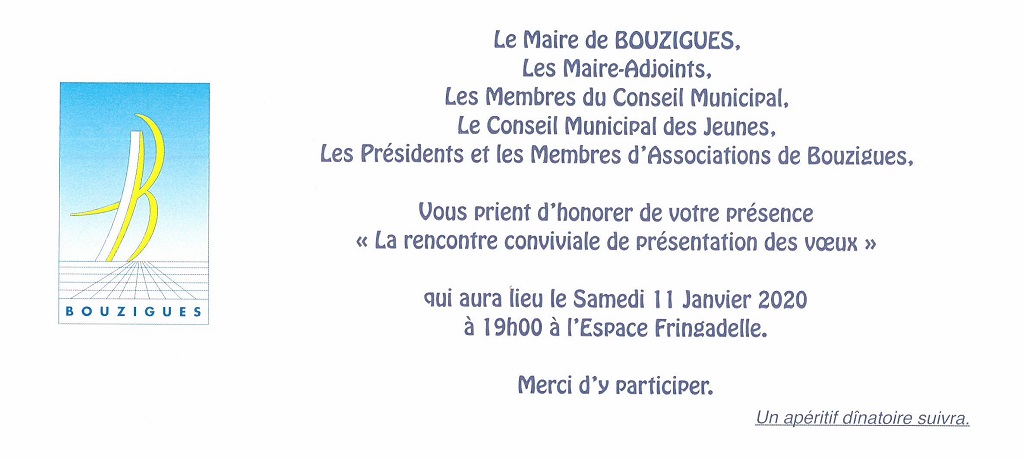Tous les Bouzigauds sont cordialement invités à la cérémonie des voeux de la municipalité et des associations le samedi 11 janvier 2020 à 19h00 à l'Espace Fringadelle.