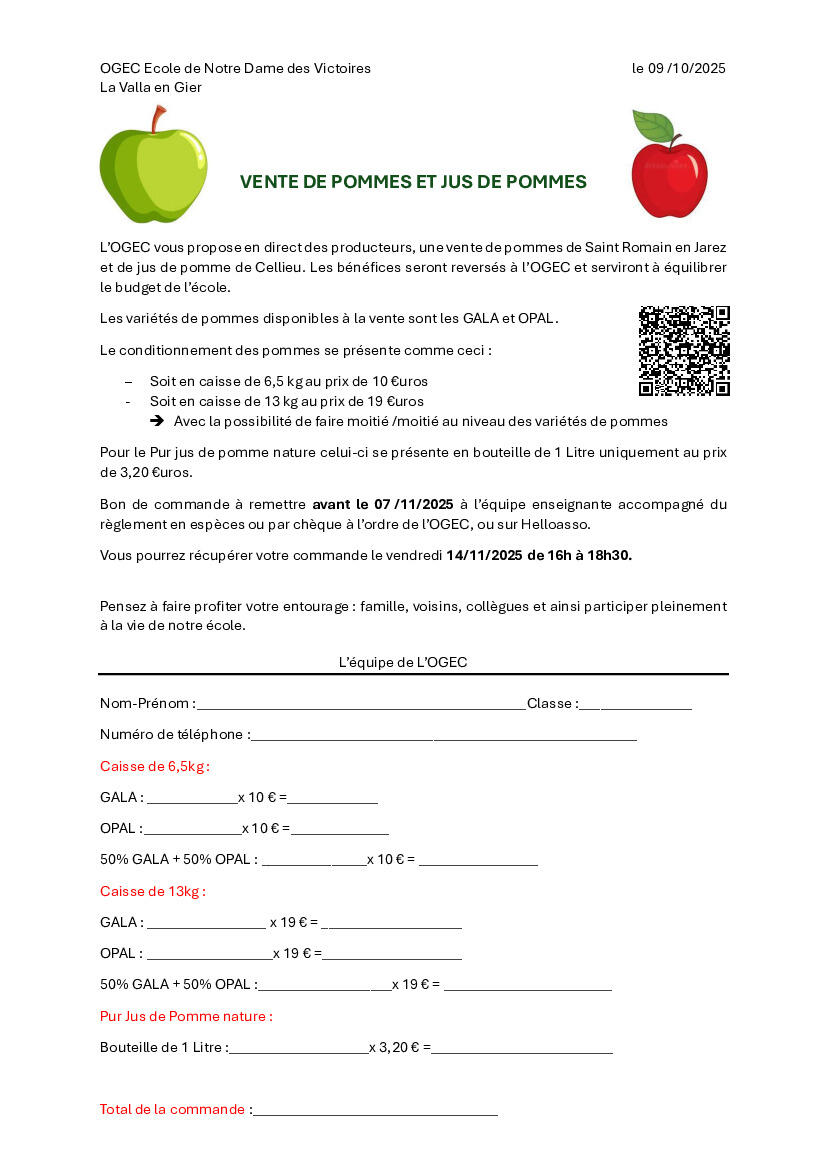 L'école Notre Dame des Victoires de La Valla en Gier organise une vente de pommes et jus de pomme de producteurs locaux (Saint Romain en Jarez/Cellieu) au profit de l'école pour maintenir l'équilibre des budgets et entretenir les locaux pour permettre à nos enfants d'apprendre dans un bon environnement. Livraison des commandes le 14 novembre dans la cour de l'école entre 16h et 18h30.