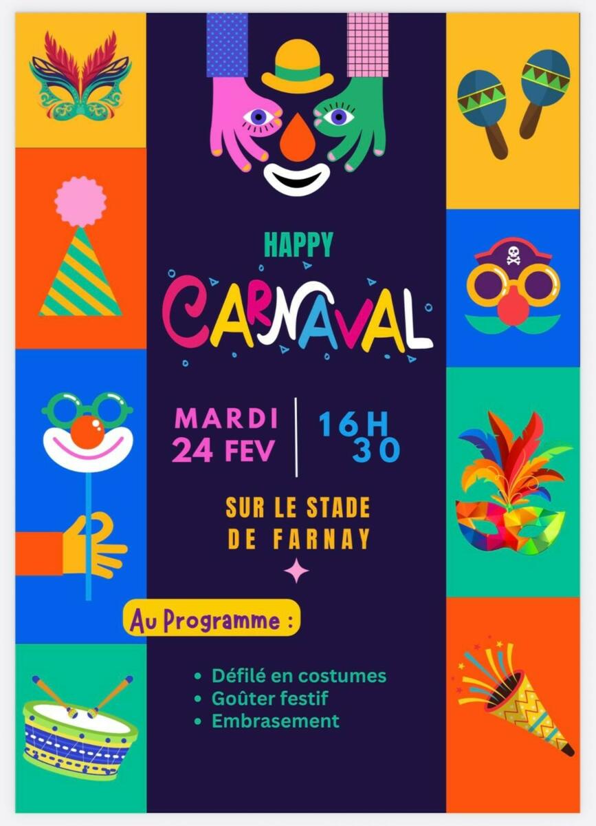 L’Association des Parents d’Élèves a le plaisir de vous convier au carnaval, qui aura lieu le mardi 24 février à 16h30, sur le stade de Farnay.