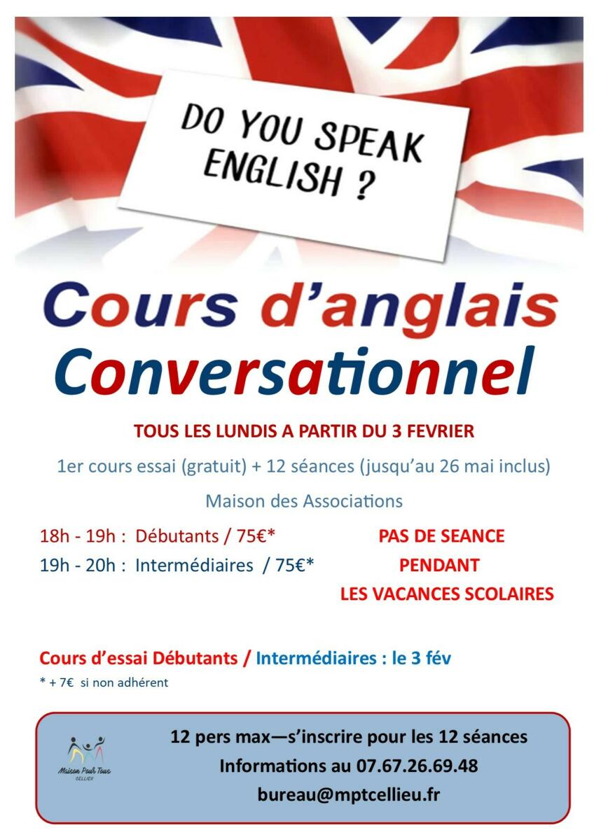 Cours d'anglais Conversationnel !Tous les lundis à partir du 3 février !12 personnes Max !Un cours d'essai gratuit !Renseignez-vous !