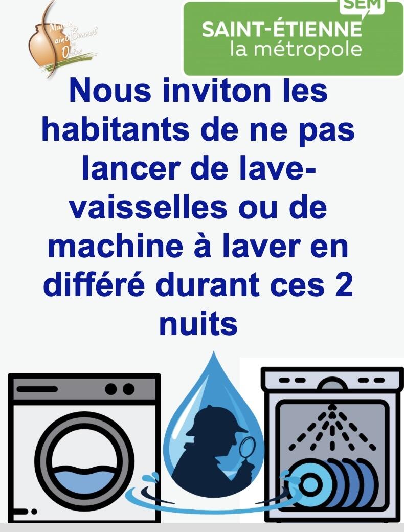 Nous invitons les habitants raccordés au réseau d'assainissement de ne pas lancer de cycles de lave-vaisselles ou de machine à laver en différé durant ces 2 nuits.