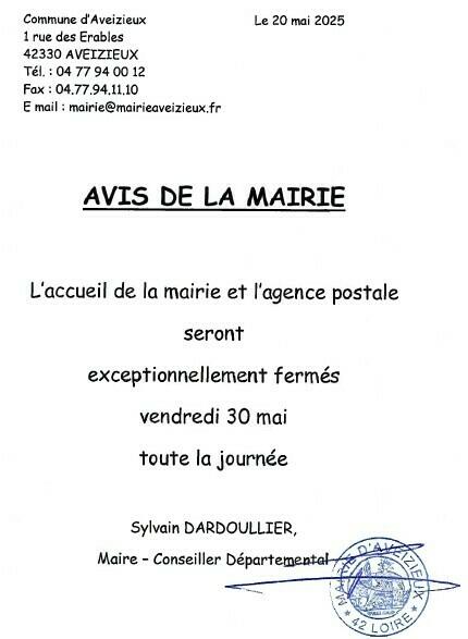 L’accueil de la mairie et l’agence postale seront exceptionnellement fermés vendredi 30 mai toute la journée