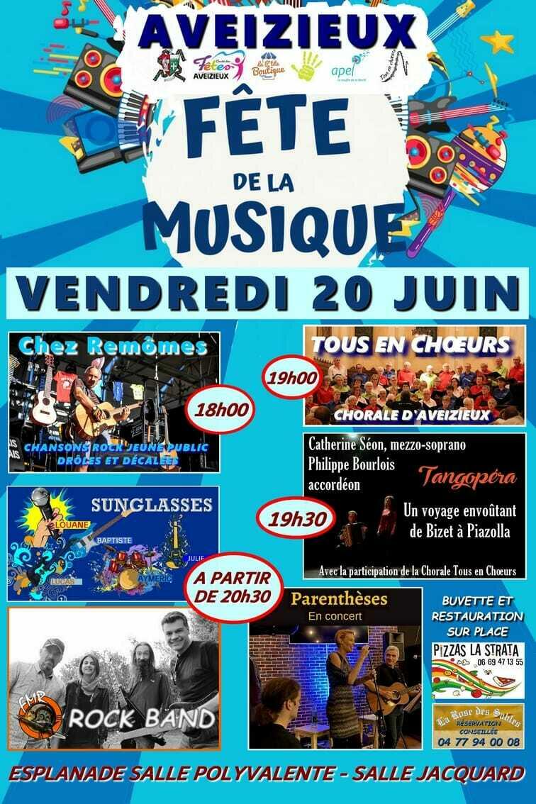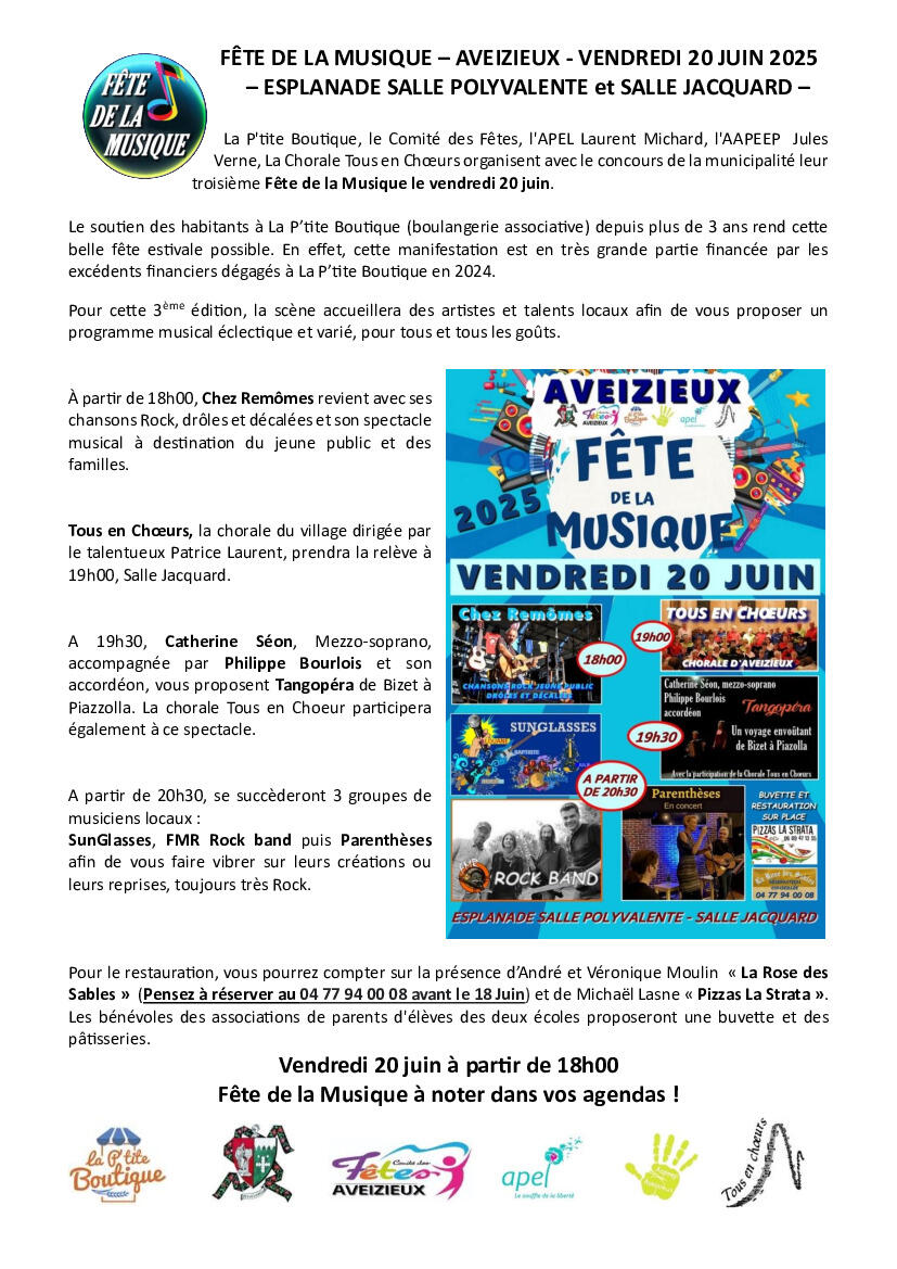 Fête de la musique 3/6/25 FÊTE DE LA MUSIQUE – AVEIZIEUX - VENDREDI 20 JUIN 2025 18h – AUX ABORDS DES SALLES POLYVALENTE et JACQUARD –