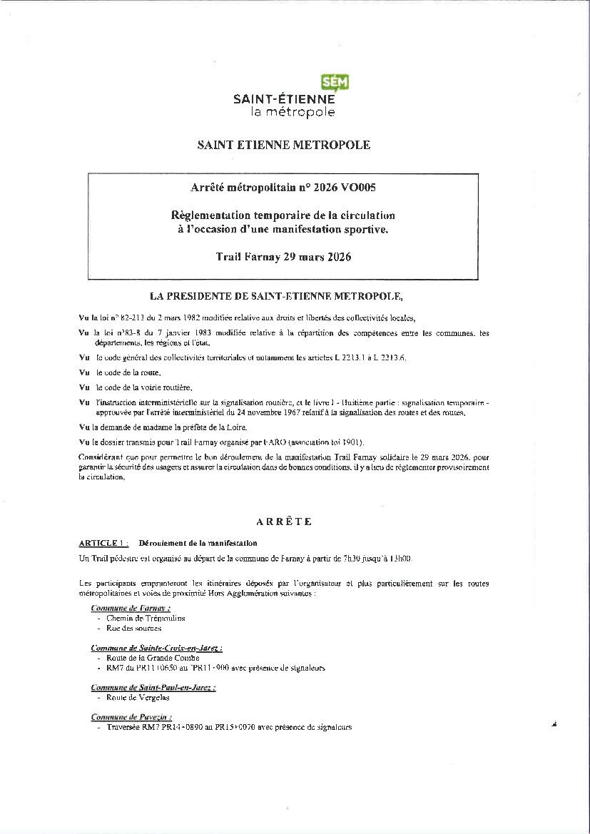 Veuillez trouver ci-joint un arrêté de circulation concernant la commune de Pavezin à l'occasion d'une manifestation sportive le 29 mars 2026.