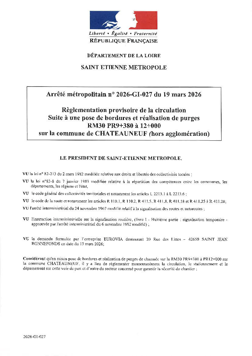 Veuillez trouver ci-joint un arrêté de circulation suite à une pose de bordures et réalisation de purges sur la commune de Châteauneuf. Le présent arrêté prend effet à compter du 31 mars 2026 pour une durée de 21 jours (jours calendaires).