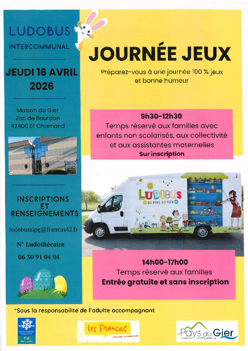 Journée Jeux 31/3/26 Une journée jeux aura lieu le jeudi 16 avril 2026 à Saint Chamond. Source : Mairie de Pavezin