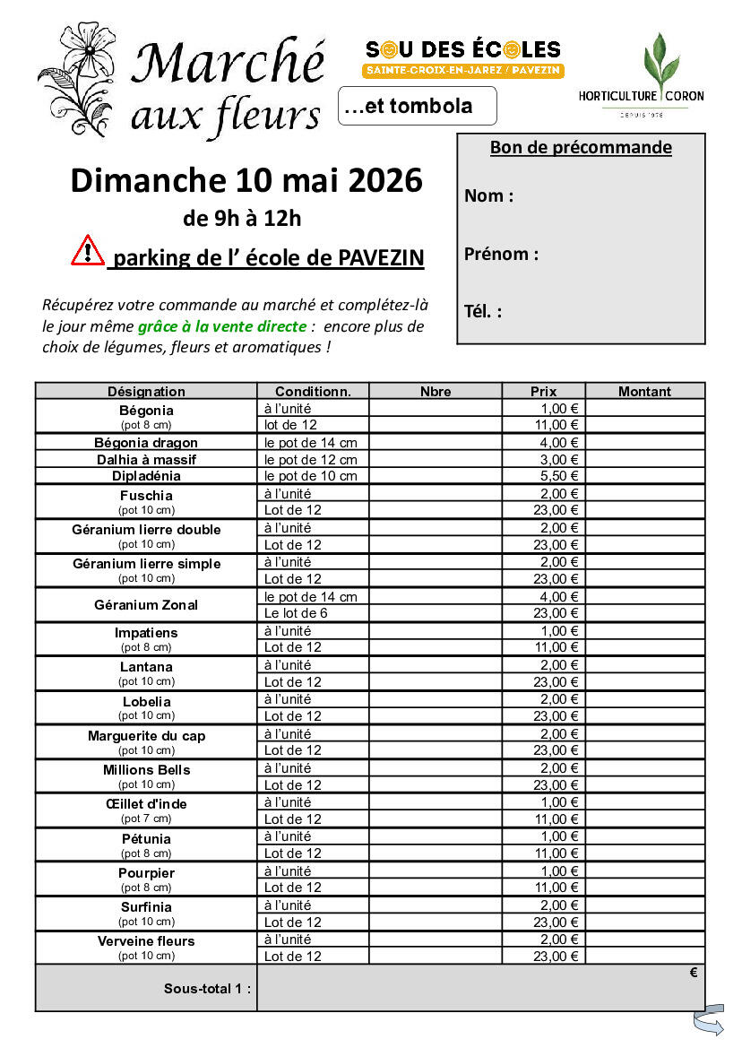 Précommande possible grâce au bon de commande  qui a été remis dans les boîtes aux lettres de tous les habitants. Ce dernier est à rendre avant le lundi 20 avril 2026 en mairie accompagné d'un chèque à l'ordre du Sou des Ecoles.