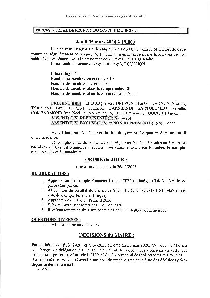 Veuillez trouver ci-joint le procès verbal du jeudi 05 mars 2026 approuvé lors du dernier conseil.