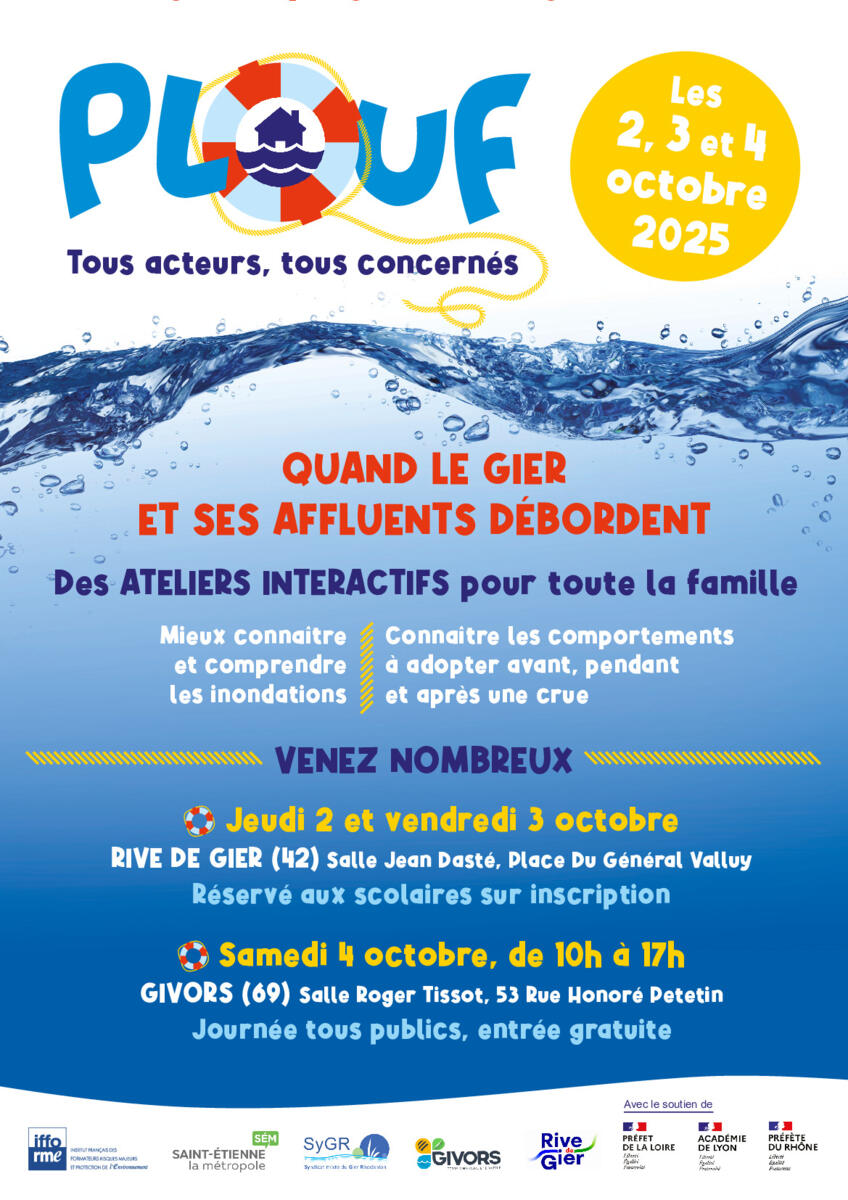 Dans le cadre du Programme d’Action de Prévention des Inondation (PAPI) Gier, Saint-Etienne Métropole et le Syndicat mixte du Gier Rhodanien organisent, en partenariat avec l’Institut Français des Formateurs Risques Majeurs et protection de l’Environnement, un village-forum de sensibilisation aux inondations du Gier et de ses affluents, appelé PLOUF.